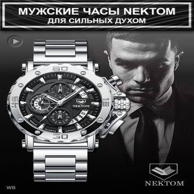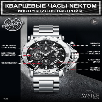 Новинка в мире часов от компании NEKTOM и WATCH-STORE. Наша большая команда является официальным представителем бренда NEKTOM в России.! Часы Мужские Наручные Nektom Quartz Silver/Black Pro это не просто наручные часы, но и идеальный Подарок Вашему Мужчине! Это память, которая всегда будет с ним. Эти модели часов для любителей по-настоящему крупных и массивных экземпляров. Цельнолитой! Браслет и Корпус Мужских Часов изготовлены из Нержавеющей Стали 316L. Сплав железа и хрома в составе стали 316L образует на поверхности защитный слой, обладающий высокими антикоррозийными показателями и особой устойчивостью к механическим повреждениям. Диаметр корпуса составляет 53 мм (шестиугольный циферблат) и 55 мм (круглый циферблат). Сердце часов - Японский Высококачественный Механизм. Всегда помни о времени, и о том, что оно быстротечно. Цени каждое мгновение, проведенное со своими любимыми и близкими людьми. Набирая скорость, не забывай про здесь и сейчас. Ведь синдром отложенной жизни затягивает и трудно отпускает. Пусть часы всегда напоминают тебе о том, что время не остановить ни на секунду. Наша коллекция часов для тех, кто не победил время, а смог подружиться с ним! Присоединяйся. Ведь мы, как талисман, приносим удачу и победу. Часы NEKTOM - это результат четко организованного производственного процесса, высококачественных материалов и швейцарских технологий. Эти мужские кварцевые наручные часы будут безусловно дополнять твой образ, доводя его до совершенства. Часы металлические наручные из стали - массивны, но при этом красивы, поступают к покупателю в подарочной коробке, с ключом для регулировки размера браслета, запасной батарейкой, тряпочкой для полировки . Отличный выбор для подарка любому мужчине, отцу, брату, коллеге, начальнику и просто другу. ГАРАНТИЯ 1 ГОД. Подчёркнуто Брутальный и Стильный Дизайн. Циферблат Черного и Серебряного Цвета с люминесцентными стрелками. Антибликовое закаленное Минеральное Стекло, устойчивое к механическим повреждениям и царапинам. Крупная апертура календаря в оригинальном дизайне по всей правой стороне циферблата. Три дополнительных функциональных Хронографа. Раскладная браслетная застежка "Бабочка". Водостойкость WR 30 (душ, дождь, брызги). Регулируемая длина Ремешка 22 см. Часы крупные! Вес 196 грамм. Обратная связь: info собака watchstorecom точка ru Обратная связь: info собака watchstorecom точка ru Наша компания имеет более чем десятилетний опыт непрерывной жизни и работы в Китае. Мы занимаемся логистикой, сертификацией и официальным таможенным оформлением товаров. Имеем собственные склады и русскоязычных сотрудников в китайских городах Иу и Гуанчжоу - центрах мирового производства. А также оказываем профессиональные и качественные услуги Фулфилмента (подготовки и сдачи товара на маркетплейсы) в Москве. Все этапы работы мы выполняем сами и полностью контролируем весь процесс. От закупки и проверки товаров в Китае, до упаковки и поставки их на склады маркетплейсов. Всё это позволяет в совокупности предложить наиболее лояльные цены и качественные товары для наших клиентов и покупателей. Но при этом, мы уважаем интересы наших коллег по площадке, и в этом претендуем на взаимность. WATCH-STORE - это лишь одно из направлений нашей работы. Но. Если наручные часы, то WATCH-STORE! Тэги: часы наручные мужские 14 февраля мужчине смарт подарок 23 папе подарки для муж